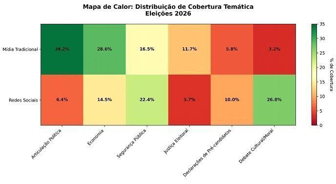 A mídia tradicional dedica sua atenção principalmente a dois temas: articulação política (34,21% das menções) e economia (28,58%). Juntos, esses dois temas representam 62,79% de toda a cobertura jornalística sobre as eleições de 2026.