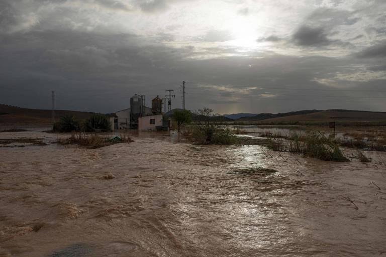 Legenda: Fazenda inundada próximo a a Malaga, na Espanha - Jorge Guerrerro AFP